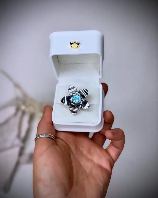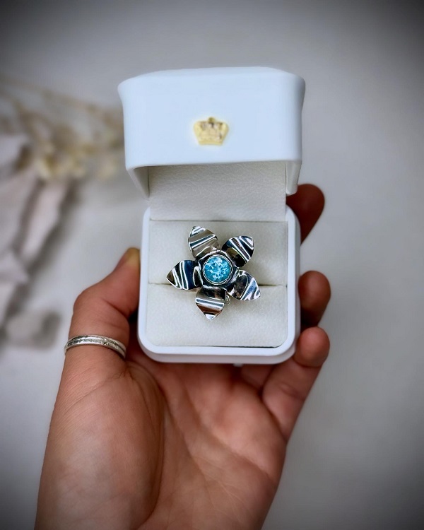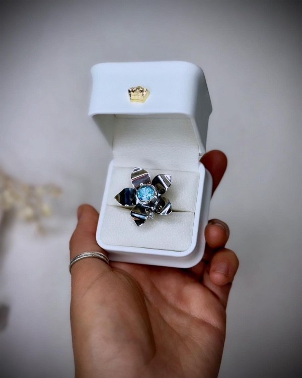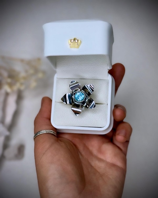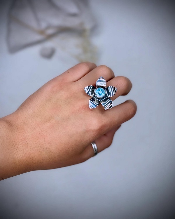 Este anillo AJUSTABLE está hecho completamente a mano en plata 950, con un diseño único que florece desde el centro de un topacio natural swiss blue -símbolo de claridad y poder interior- y acompañado de una delicada aguamarina, guardiana de la intuición, calma y la verdad interior.