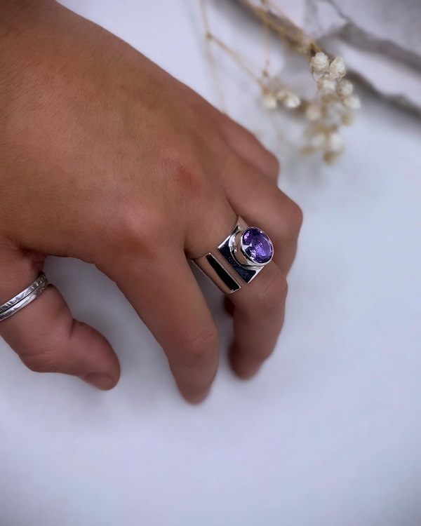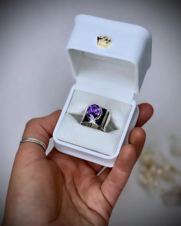 Precioso e imponente anillo ajustable. Hecho completamente a mano en plata 950, con una piedra natural de amatista hermosa y potente por naturaleza, este anillo no es solo una joya: es una declaración de poder. Es decirle a quien lo lleva que ella es su propio reino. De ahí nace su nombre: SOBERANA.