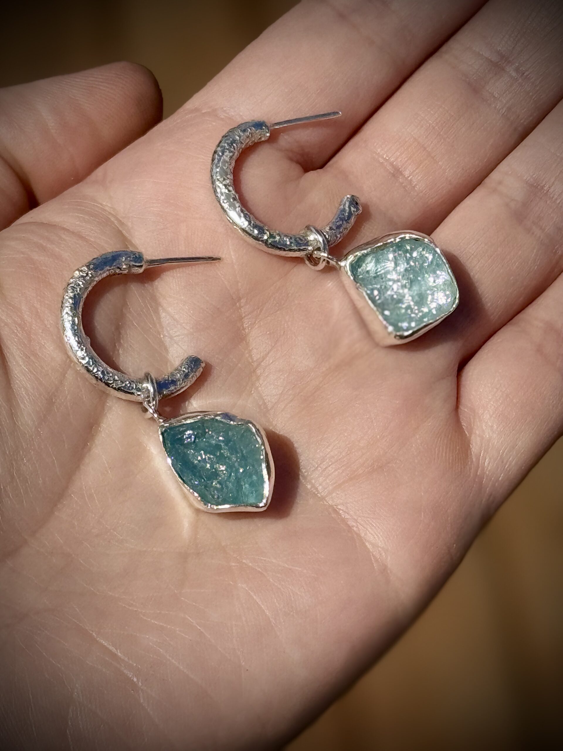 Forjados completamente a mano, en plata 950, con dos aguamarinas naturales en bruto. (Incluyen los topes respectivos de los aros)