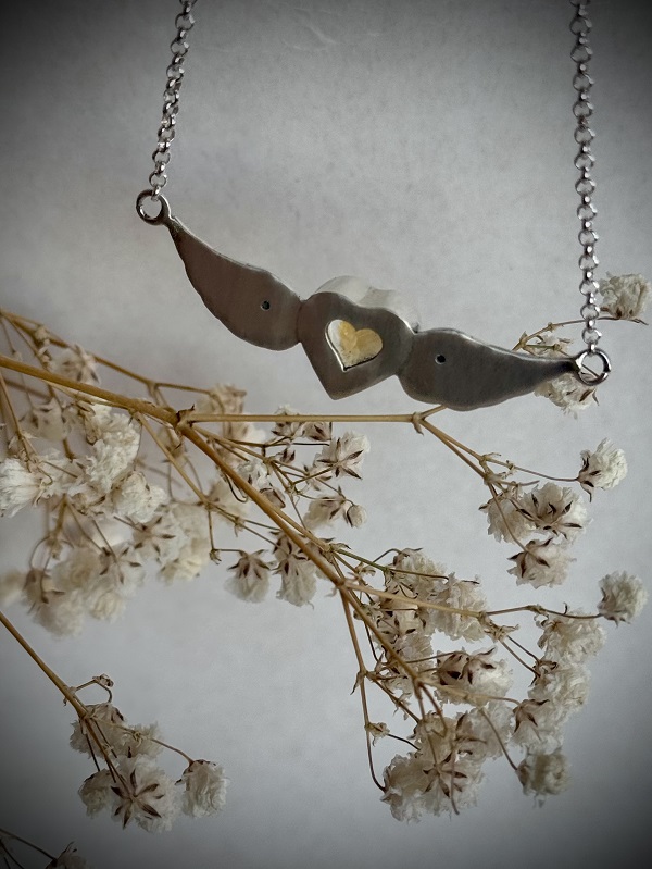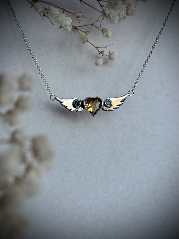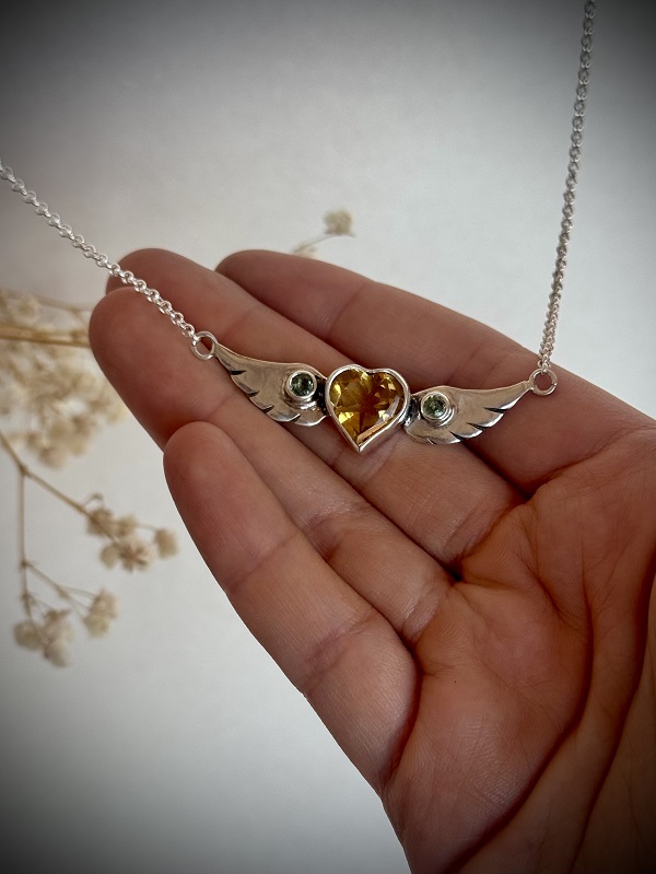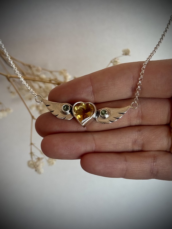 Collar hecho completamente a mano, en plata 950. Está realizado con un citrino natural precioso con forma de corazón, y 2 zafiros verdes naturales en sus alas. Representa el alma y corazón libres. Incluye su respectiva caja para guardarlo, un paño de microfibra para limpiarla, un espejo de Paz Lobos Joyería, dos hermosos stickers con diseños propios, y tips de cuidados.