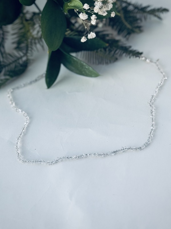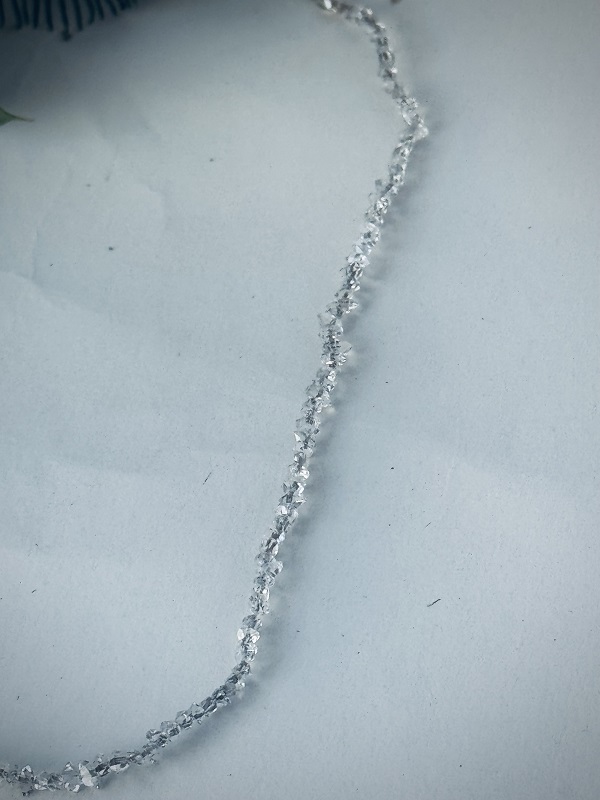 Cada cristal con sus formas únicas e irregulares, te viene a recordar que la verdadera belleza no está en lo intacto, en lo perfecto… sino que en cada «irregularidad», o en cada «grieta»… es un parte de nuestra historia, de nuestra sabiduría, de nuestra luminosidad… que brillamos no a pesar de las grietas, sino que gracias a ellas… es honrar nuestra fortaleza y, entereza, de nuestra historia. Los Diamantes de Herkimer a lo largo de la historia ancestral, han sido considerados «piedras de luz», amplificadores de energía y claridad espiritual; representan pureza y despertar, ayudando a elevar la conciencia y conectar con planos superiores; promueve en los procesos de sanación emocional y energética, actuando como un canal que libera bloqueos y potencia la intuición; su transparencia con inclusiones naturales recuerda que la perfección no está en la ausencia de marcas, sino en la luz que atraviesa cada una de ellas. Este tesoro está hilado a mano, con piedras naturales de diamantes de herkimer (no son diamantes verdaderos, su nombre es por su brillo similar al diamante y su estructura única sin tallar. Son cristales de cuarzo excepcionalmente claros y de doble terminación, con dos puntas naturales, que se encuentran principalmente en el condado de Herkimer, Nueva York). Mide 40 cm aprox e incluye de 3 a 5 cm aprox de argollas de plata 950 para acomodarlo a gusto personal. Cada una de mis joyas incluye un sobre o caja respectiva para guardarlas correctamente, unos chocolates deliciosos Liberté (chocolatería chilena), 1 paño de microfibra para su correcta limpieza y 1 tarjeta de tips de cuidados.