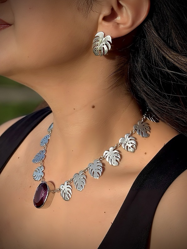 El Collar Reina Monstera, abraza el centro con una amatista natural, piedra sagrada de transformación, intuición y calma.