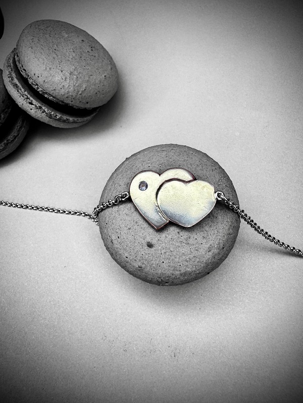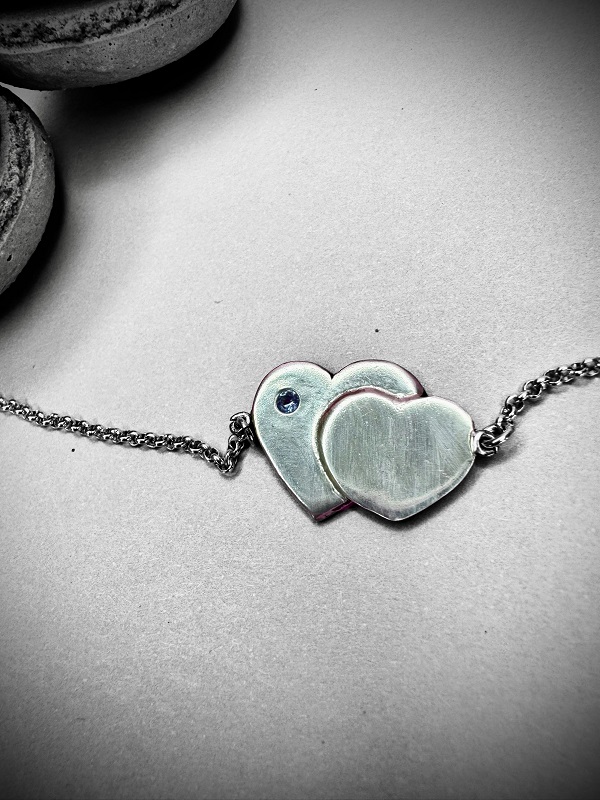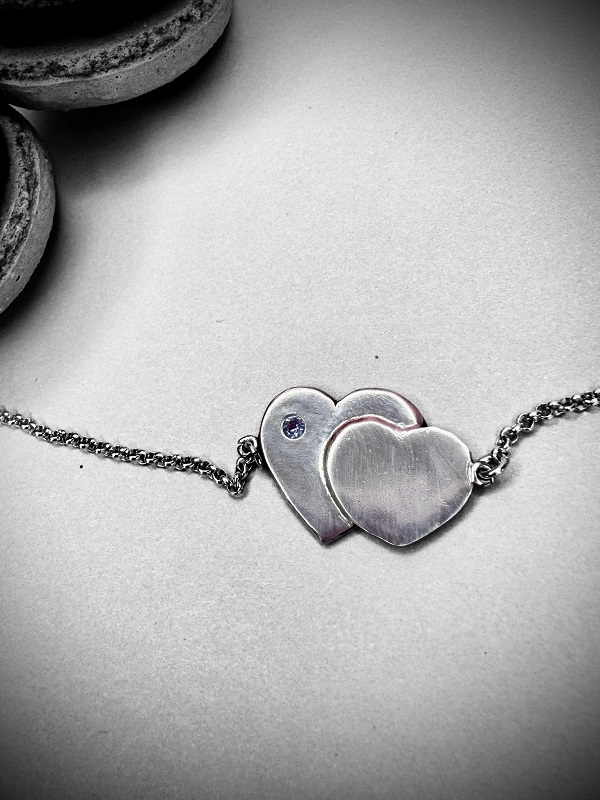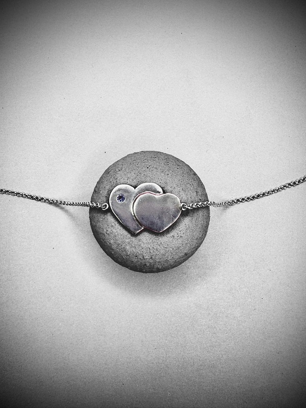 Precioso collar hecho a mano, en plata 950, que representa la unión eterna de dos corazones. Tan único, y femenino. Dentro de él hay una piedra natural de tanzanita. Incluye su respectiva cadena de 45 cm, con una extensión opcional de 3 cm de argollas de plata 950. Incluye su respectiva caja para guardarlo, un paño de microfibra para limpiarla, un espejo de Paz Lobos Joyería, dos hermosos stickers con diseños propios, y tips de cuidados. Por compras sobre $70.000 te llevas completamente de regalo 5 ml de limpia joyas “Pepetools”, una marca de Estados Unidos, que es lejos lo mejor que he conocido para limpiar joyas; es natural, biodegradable, y libre de amoniaco, para que siempre tu joya luzca como nueva!