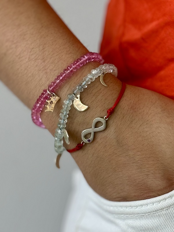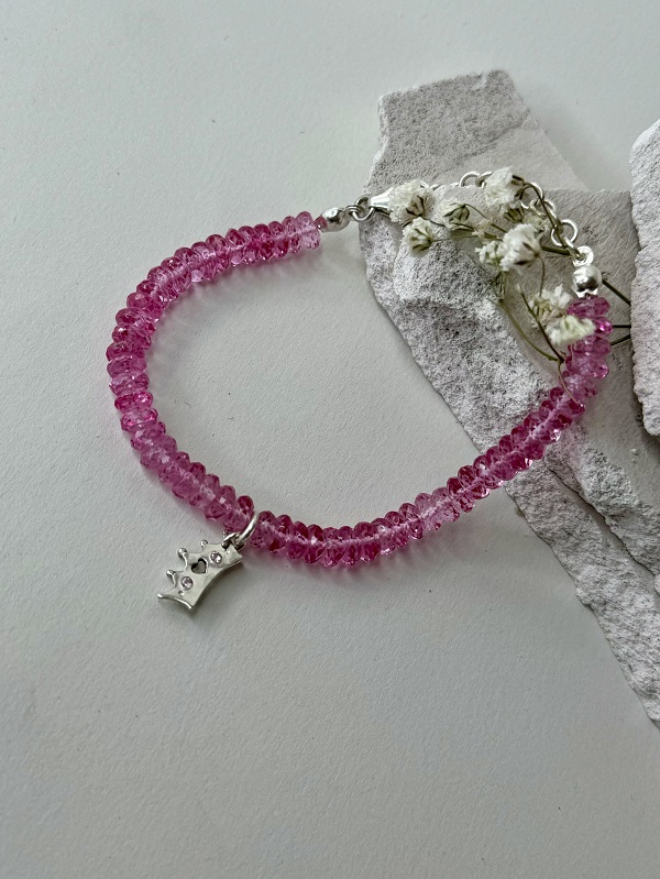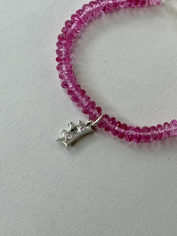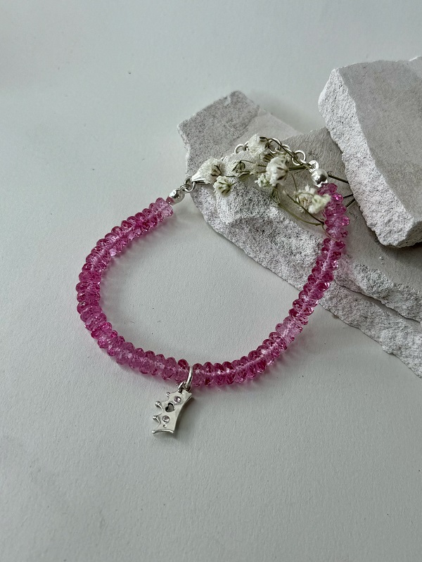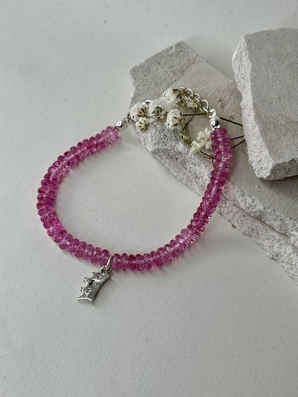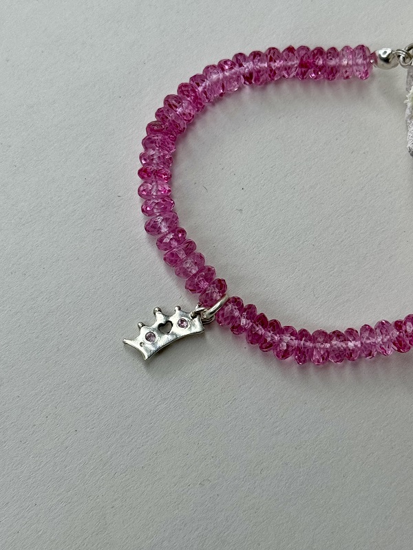 Hermosa, exclusiva y delicada pulsera, con una corona de Reina, hecha a mano en plata 950, con dos zafiros rosados naturales rosados, e hilada con piedra natural de topacio rosado. Mide 17 cm, además incluye un extensor de hasta 3 cm de argollas de plata 950. Incluye su respectiva caja para guardarlo, un paño de microfibra para limpiarla, un espejo de Paz Lobos Joyería, dos hermosos stickers con diseños propios, y tips de cuidados.